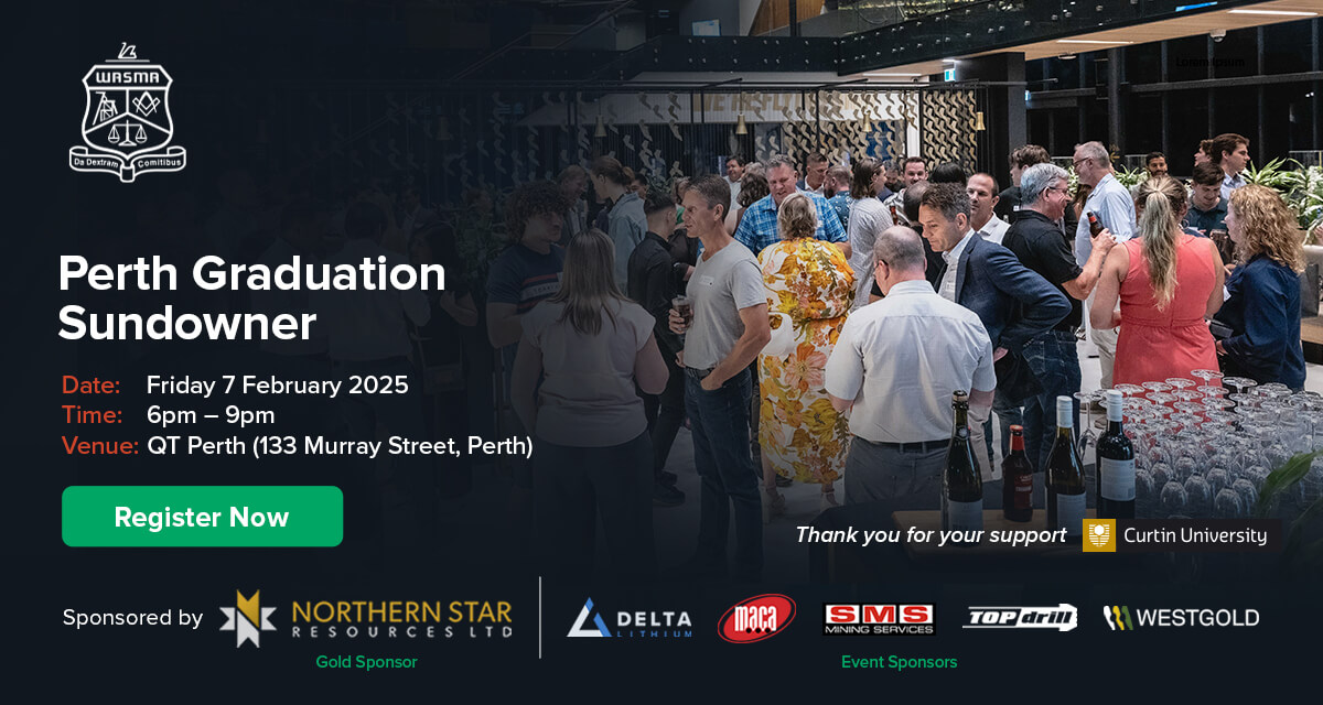 The WA School of Mines Alumni (WASMA) invites the WASM:MECE, surveying and geology graduates from the class of 2024 to attend our WASMA Perth Graduation Sundowner. This is our way of congratulating you on completing your studies and formally welcoming you into the Alumni.